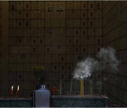一處私人墓地的骨灰龕位前,香火繚繞