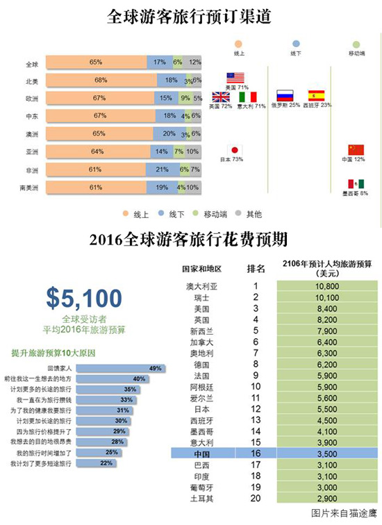 从全球范围内来看,年龄段在65岁以上的老年受访者的旅游年预算最为充足,平均每人达到8736美元,而18~34岁受访者相对保守,人均旅行预算为2915美元;从国家范围来看,澳大利亚受访者的年均旅游预算额度最高,达10800美元,中国受访者2016年的旅行预算在全球范围内排名第16,平均为3500美元(约22800元人民币),低于全球平均水平(5100美元)。此外,49%的全球受访者表示计划增加旅行预算的原因是为了回馈自己和家人,而中国受访者的这一比例是61%。