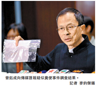【香港商报网讯】记者李淇报道:立法会上周六於会议室2进行公开聆讯期间,会计界议员梁继昌的裤管沾到被怀疑是粪便的不明物体,惹起轩然大波。立法会主席曾钰成昨日会见记者,表示经私人及政府化验所分别化验后,证实该物质是排泄物的可能性非常低,应非粪便,而是用於黏合木条的合成聚合物;但强调立法会仍会继续加强保安及清洁措施,相信再发生类似事件的机会不大。