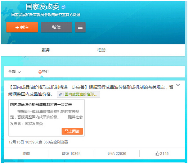 國家發改委15日表示,將暫緩調整國內成品油價格,意思也就是暫不降價。發改委當時給出的理由是這樣做可以充分發揮成品油價格杠桿作用,促進資源節約和治理大氣污染。這件事在輿論場激起軒然大波,一些人指責發改委漲價積極,降價則是另一種態度。