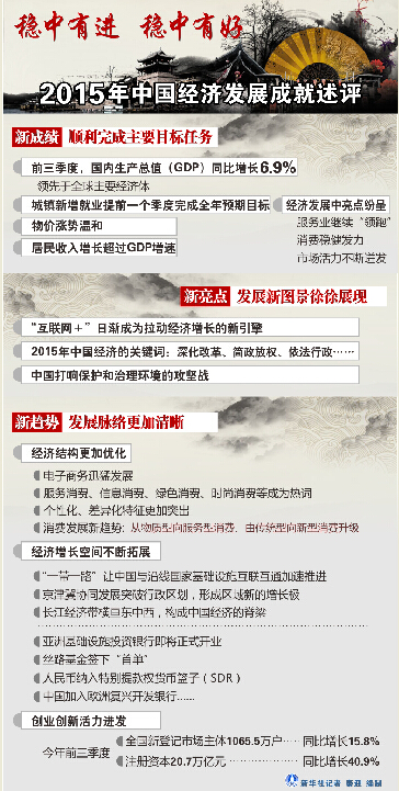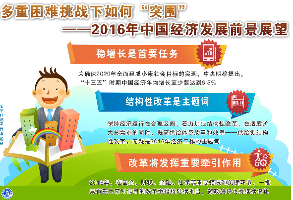 与此同时,明年是全面建成小康社会决胜阶段的开局之年。为此,中共中央政治局日前召开会议指出,要坚持「稳中求进」总基调,坚持稳增长、调结构、惠民生、防风险,实行「宏观政策要稳、产业政策要准、微观政策要活、改革政策要实、社会政策要托底」的总体思路。有专家预期,中国以将更大力度实施创新驱动战略,积极稳妥推进企业优胜劣汰,继续深化国企、财税、金融等重点改革,不断扩大有效供给,保持经济运行在合理区间。