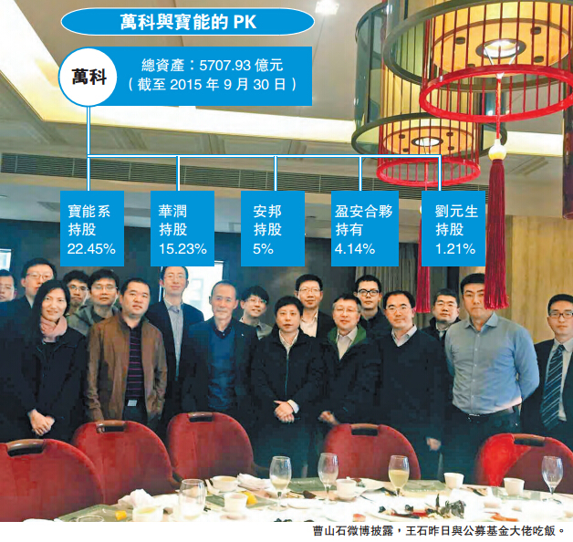 【香港商报网讯】继万科管理层和新晋第一大股东「宝能系」公开对立之后,双方已经从股权暗战进入资本和资源比拼的新阶段。万科董事局主席王石昨日与一众公募基金负责人餐叙,此举被指筹资备战,而对手宝能系亦被传谋划百亿融资。分析认为,「银弹」对抗已成万科争夺战的关键因素。另外,万科昨晚发布公告称,公司预计在不超过30个自然日的时间内披露本次重组方案,A股股票最晚於2016年1月18日恢复交易。值得注意的是,万科承诺在证券恢复交易后3个月内不再停牌筹划重大资产重组事项。