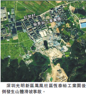 深圳光明新區鳳凰社區恆泰裕工業集團後側發生一起山體滑坡事故,光明新區安監部門相關負責人表示,事發原因初步斷定是臨時餘泥渣土受納場違規作業。