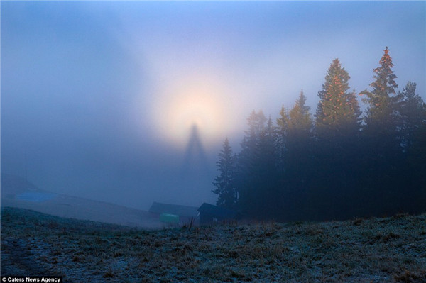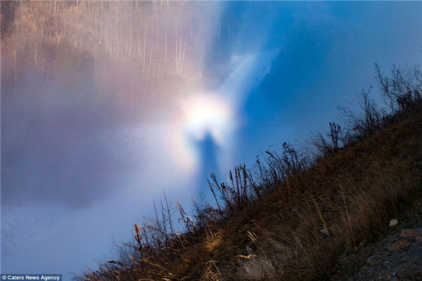实际上和中国人常说的“佛光”现象原理一致。每当雾气茫茫,太阳低沉,而摄影者恰巧又在高山上,人影经过一系列复杂的光学变化就会被放大投射到云层上。照片中的人影其实是摄影者本人。