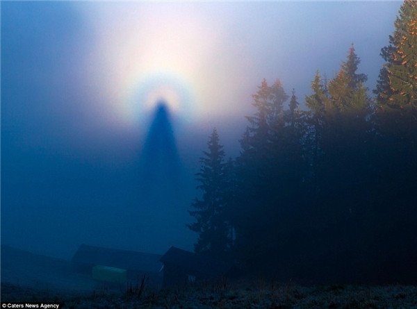 事实上,这种光学现象被称为“布洛肯幽灵”,由于多发在德国布洛肯山上,故得此名。