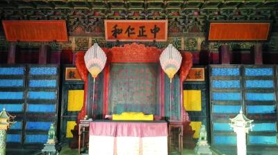走进大殿,从前朝到后寝,陈设的绝大多数文物包括帝后卧榻上的被褥、帷幔等,都颜色黯淡。从明间通往西暖阁的木门,红色油漆斑斑驳驳,门上的寿、福两个金字也已褪了色;东暖阁“垂帘听政”用的帘子竟已呈现灰褐色,让人难以想象当年慈禧在它后面颐指气使的场面。