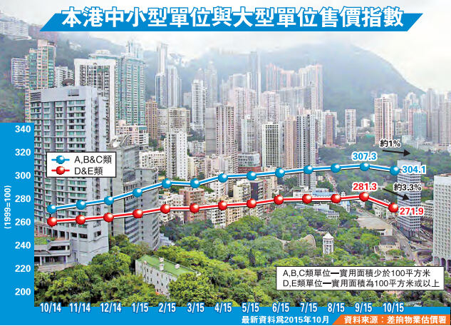 香港置业高级执行董事伍创业昨日表示,尽管本港银行暂未跟随美国加息,惟楼市早已应声下挫,预期明年楼市持续低迷,整体楼价会跌约5%至10%,逾千万元豪宅更有机会跑输大市,呈价量齐跌局面,楼价将跌约15%,主因受金管局调低按揭成数影响,犹如为豪宅加上「紧箍咒」,市民难以借贷,换楼速度严重受到影响,「细楼换大楼」的情况大幅减少。同时内地买家认购本港豪宅的比率持续减少,难免拖累豪宅表现,除非金管局放宽「逆周期」措施,否则明年豪宅仍难突破。