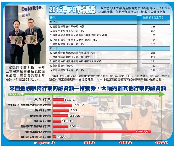 德勤中國全國上市業務組聯席領導合夥人歐振興表示,今年上市宗數創香港新股的歷史最高,新上市企業數量按年增加12家,集資額較上年提升14%至2603億元,其中八成融資金額來自9隻超大型及7隻大型新股。