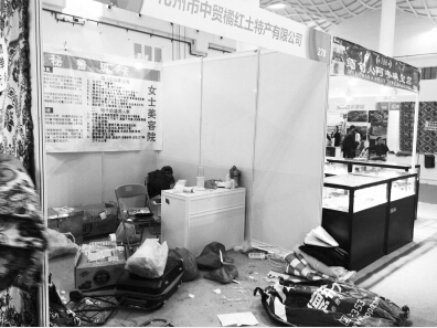 記者在現場看到,雖然展會還沒有結束,但近半參展商已打包好展品準備撤離,現場較為混亂,其他商家趁機混進來銷售一些商品。記者看到,在一些展位中間的過道上,部分商家在銷售皮大衣、銀首飾、玩具飛機等。