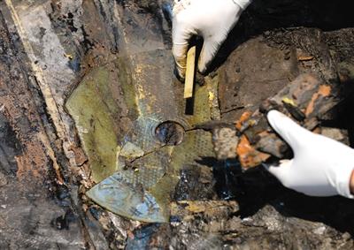 工作人员介绍,内棺南侧的这部分空间,发现了几十个马蹄金、麟趾金,与此前不同,此次马蹄金上还镶有琉璃。专家称,在汉代,这种技术只有皇室贵族掌握,发现琉璃,也能证明墓主人的身份定不一般。