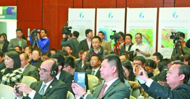 “聚焦南沙,推動自貿區建設發展高峰論壇”的參會專家被嘉賓的演講所吸引,紛紛拍照。 記者 符超軍 攝