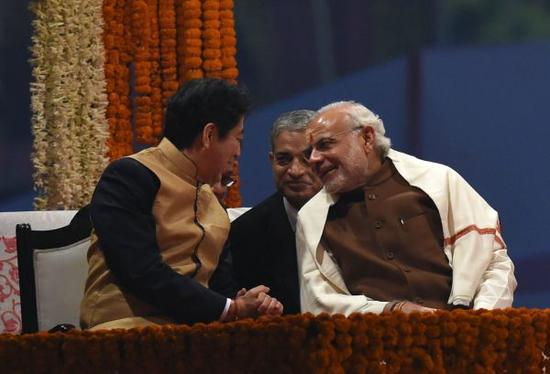 日本加紧拉拢美国、澳大利亚和印度等国,打造对华包围网。图为12月12日日本首相安倍晋三访问印度,会晤印度总理莫迪。(法新社)