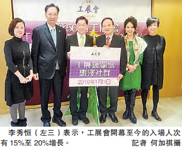 廠商會昨日舉行傳媒午宴,簡介今屆工展會目前的入場人次。會長李秀恒表示,幸得天公造美,由開幕至今的入場人次情況理想,對比去年暫時更有15%至20%增長,有機會打破去年總入場人次紀錄。他又指,在周末及公眾假期的人數明顯較多,雖然內地客今年人數有下降,但本地客人數則有明顯上升,認為可彌補客源流失。而今年亦撥出400萬元繼續進行「工展顯關懷」慈善計劃,將工展會的歡樂及關愛送到社會各階層,與市民分享成果。