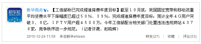 【工信部稱已完成提速降費年度目標】截至10月底,我國固定寬帶和移動流量平均資費水平下降幅度已超過50%、39%,完成提速降費年度目標;預計全年4G用戶突破3.8億,IPTV用戶超4500萬;今年工信部配合相關部門處置違法違規網站4378家,競爭秩序進一步規范。