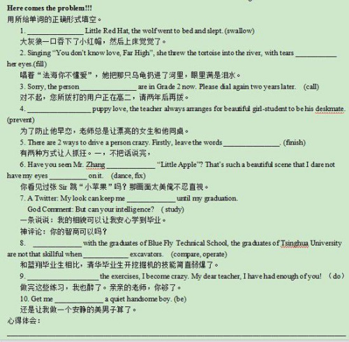 据《重庆商报》报道,考卷上的10道英语填空题,每一题都加入了热门网络元素,比如神评论、画面太美不忍直视、安静的美男子、蓝翔毕业生等等,让人大呼意外。