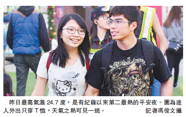 【香港商報網訊】記者周偉立報道:天文台昨日下午錄得最高氣溫攝氏24.7度,是有記錄以來第二個最熱的平安夜。但隨着一股冷鋒抵港,預料市區今日氣溫會跌至16度,新界會再低1、2度,聖誕假期期間天氣會較涼,氣溫介乎15至18度,有一兩陣雨。