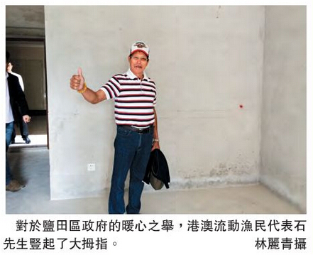 「在盐田有了自己的大户型房产,可以让父母、子女一起居住,这对我们这些一年只挣十多万港元的渔民来说无异於天方夜谭,就像是中了六合彩一样!这在全世界都是独一无二的好事!」深圳五届人大代表、盐田港澳流动渔民协会副会长陈苏说起这件事来,同样是激动得手舞足蹈,「这是深圳市和盐田区对港澳流动渔民极大的关照和优惠,让我们渔民感动得难以忘怀。」记者随陈苏实地探访过他的新房后,也是羡慕不已。只见梧桐山脚下,几栋淡黄色的、高达30多层的新楼房在阳光下高耸入云,熠熠生辉。「这要在香港,可以算是半山豪宅了!」巡视着即将属於自己的新房,陈苏兴奋地对记者说:「盐田的港澳流动渔民能分到这样好的房子,真是打心底感谢祖国、感谢深圳,感谢盐田!」