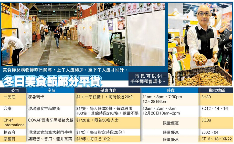 【香港商报网讯】记者何加祺报道:第13届「香港冬季购物节」及「香港冬日美食节」由即日起至周日於会展举行,号称是历年「最大规模」。虽然今年不少参展商继续推出「1蚊平货」招客,但在昨早开幕时,人流十分稀疏,不少「1蚊平货」摊位更无人问津,有推出1元试食鲍鱼的参展商称,对昨早的反应未如理想感到失望,又指以往一开幕便已经「大排长龙」,认为主办单位宣传不足。至下午展场人流已渐见增多。