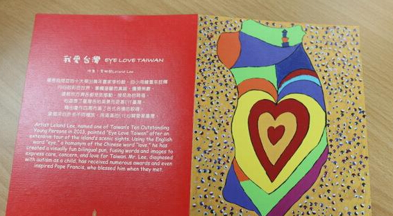 这张名为“我爱台湾EYE LOVE TAIWAN”的贺卡,是由罹患自闭症的十大杰出青年画家李柏毅所绘制。他游历台湾各地的美景,藉由画作四周布满各式各样的眼睛,象征来自许多不同的种族,用满满的“EYE”心关爱着台湾。