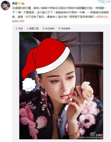 不少虐狗段子表达了单身狗的心声。24日,《甄嬛传》华妃扮演者蒋欣在微博分享名为“单身汪的圣诞幻想”的段子,称:“在这样的节日里,会有人捧着大束鲜花出现在你面前然后轻声对你说‘麻烦让一下。’嘿!不要气馁,没什么大不了!这个时候你只需做一件事,一把抢过花掉头就跑,这样,你不但有了鲜花,还会有人‘追你’哦!想想是不是很幸福啊?”结束了与叶祖新的恋情,重回单身的蒋欣是不是很理解单身狗们的心情?
