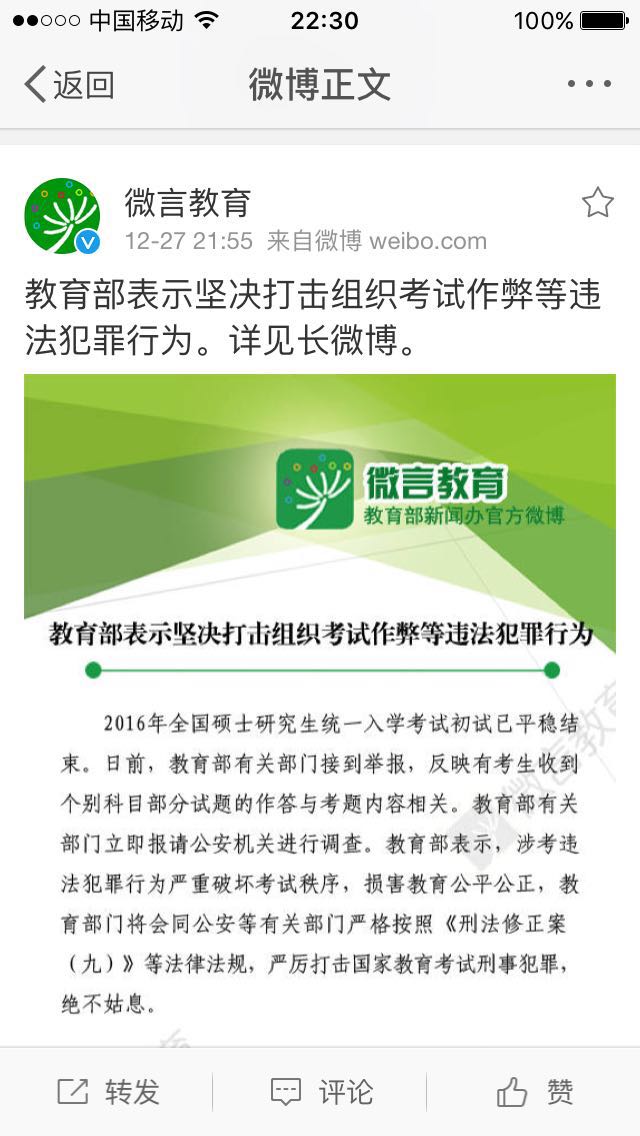 這條長微博顯示,2016年全國碩士研究生統一入學考試初試已平穩結束。日前,教育部有關部門接到舉報,反映有考生收到個別科目部分試題的作答與考題內容相關。教育部有關部門立即報請公安機關進行調查。教育部表示,涉考違法犯罪行為嚴重破壞考試秩序,損害教育公平公正,教育部門將會同公安等有關部門嚴格按照《刑法修正案(九)》等法律法規,嚴厲打擊國家教育考試刑事犯罪,絕不姑息。