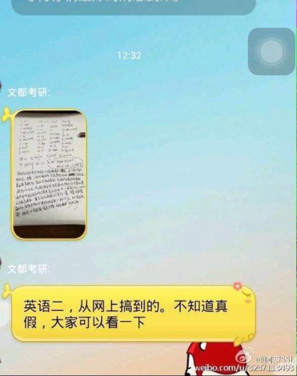 有爆料人稱,截圖是12月26日中午科目英語二考試前,相關考研微信群、QQ群和一些考研機構流傳答案的證據,結果顯示和后來的英語二考試內容完全一樣。