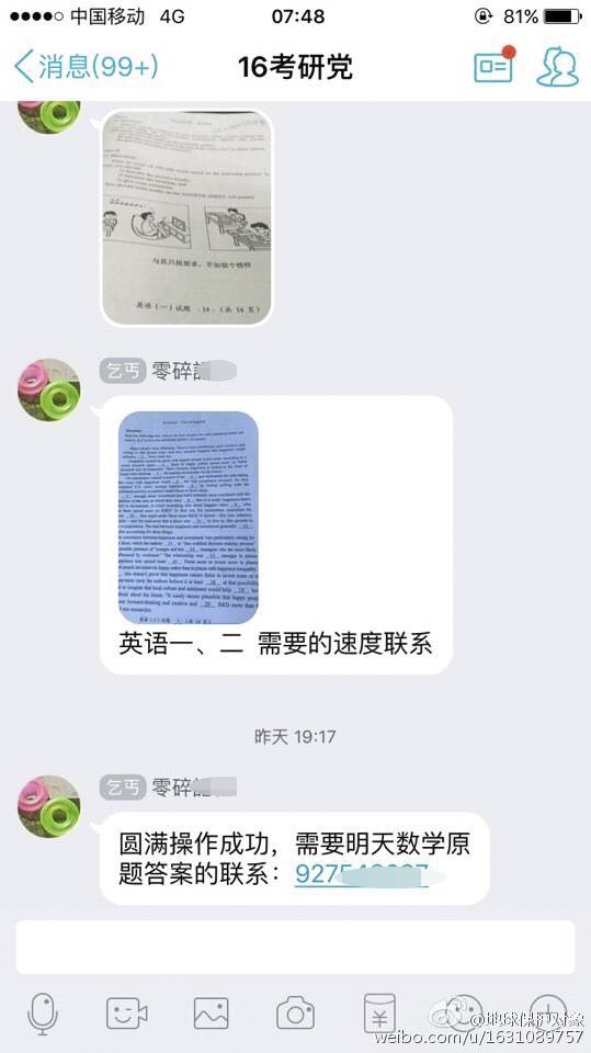 從網友的爆料材料來看,內容多是微博、微信截圖。其中,截圖顯示有英語考題的翻譯、完形填空、重點單詞等答案和提示等信息。