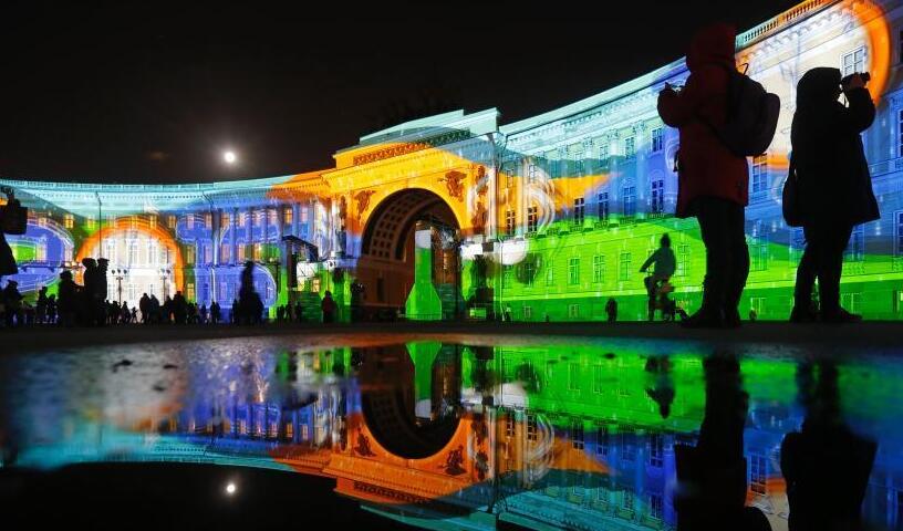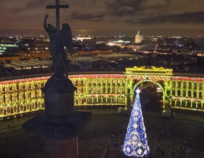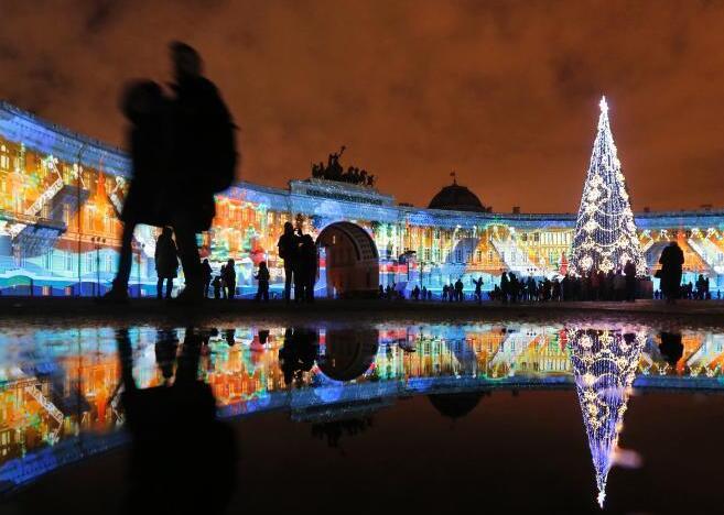 當地時間12月24日,俄羅斯圣彼得堡,宮殿廣場舉辦燈光展,慶祝圣誕新年雙節到來。