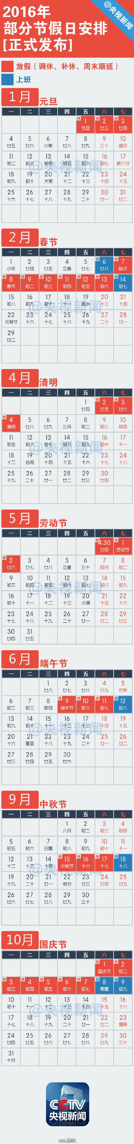 2016年度放假安排公佈:1元旦1月1日放假 2春節:2月7日(除夕)-13日放假,2月6日、14日上班 3清明:4月4日,連休3天 4勞動節:5月1日,連休3天 5端午:6月9日-11日放假,12日上班 6中秋:9月15日-17日放假,18日上班 7國慶節:10月1日-7日放假,10月8日、10月9日上班。