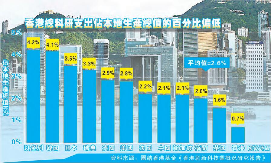 團結香港基金的報告指出,香港的研發支出總和只占本地生產總值的0.73%,較新加坡(2.1%)、韓國(4.2%)和中國(2.1%)都要低(其中深圳為4%,北京為6%)。經濟合作與發展組織(OECD)各成員國平均科研支出超過全國生產總值的2%。香港毗鄰的深圳研發支出約100億美元,足足是香港的5倍。
