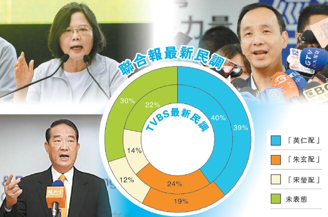 無獨有偶,《聯合報》昨早發布民調,蔡英文在首辯的表現也獲得31%民眾的肯定,好評優於宋楚瑜和朱立倫的21%。「英仁配」也以39%的支持度,繼續領先「朱玄配」的19%、「宋瑩配」的12%。比起本月26日的民調相比,「英仁配」支持度減少2個百分點,「朱玄配」維持19%,而「宋瑩配」從10%增至12%。