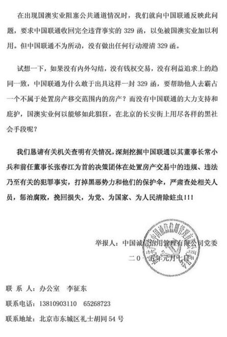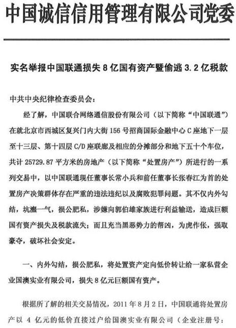 《融讯财经》获得这份由中国诚信信用管理有限公司(下称中诚信)党委发出的实名举报信,信函中,中诚信党委举报常小兵及前任董事长张春江(2011年被判处死刑)向郭伯雄家族进行利益输送,造成国有资产大量流失。