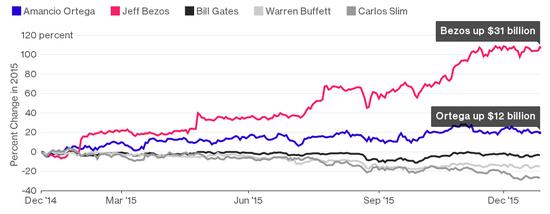 對于這個星球上最富有的人來說,2015年算不上是好年景。彭博億萬富翁指數顯示,全球400位頂級富豪2015年總共流失了190億美元資產。這也是該指數2012年推出以來首次出現年度下跌。