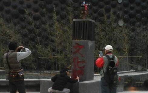 成龍捐贈的獸首下午約5時遭三位民眾用噴漆
