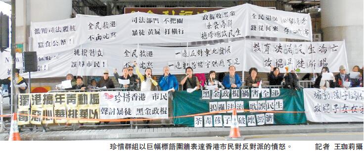 由於游行引致封路,有電車乘客不滿,在車上指罵游行人士。珍惜群組約20名成員則在鵝頸橋灣仔消防局鄰近的一段游行路線,以大幅壯觀標語圍牆表達香港市民的憤怒,批評反對派破壞香港法治及教壞年輕人。團隊在游行隊伍經過時,成員高叫「黑金政棍袋高薪」、「誤導孩子抗政府」、「煽動青年搞港獨」等口號,抗議「政棍」在立法會內拉布窒礙香港發展。