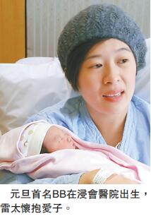 新一年首位元旦男嬰於零時零分在浸會醫院瓜熟蒂落,體重3公斤,為港人父母雷氏伉儷的第二胎。雷父為制衣商人,夫婦倆早年赴英國讀書時相識,2010年結婚,已育有一名4歲半長子。雷太稱,第二胎的預產期原定在本月19日,但昨晚突然作動,4小時后便順產,早了近3周出世。雷太說:「哥哥現在多個伴一家人都好開心,希望距健康開心地成長。」