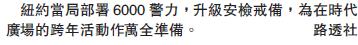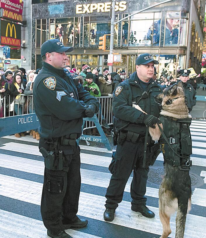 由於受到恐襲陰霾影響,紐約時代廣場的跨年倒數活動如臨大敵。紐約當局當日共部署6000名警力,比2014年還多出動500名警力,并升級了安檢戒備。記者看到,倒數活動現場有多名持自動步槍的特警不斷穿梭在人群及車站內,警犬也隨時待命巡邏。紐約市長白思豪日前就指出,紐約要做萬全的準備,并要讓人知道「在紐約跨年是超級安全的」。