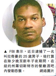 據FBI紐約州分部透露,一名叫拉奇曼的25歲男子密謀於除夕晚至新年子夜期間,在紐約州羅切斯特市的餐廳酒吧內發動恐襲,并以IS的名義殺死無辜民眾,幸好執法人員及時挫敗了他的陰謀。美國全國廣播公司(NBC)指出,拉奇曼是一名伊斯蘭教皈依者,此前他已經向IS頭目巴格達迪宣誓效忠,并試圖離開美國投奔IS。據悉,羅切斯特市是紐約州僅次於紐約和該州首府布法羅的第三大城市。
