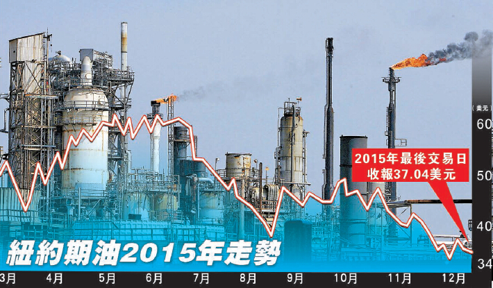 紐約2月份期油價及倫敦2月份布蘭特期油價,雖然於2015年最后1個交易日回升,但全年計仍分別跌30.5%及35%。其中,紐約期油創1998年以來首次連跌2年紀錄,而布蘭特期油價則連跌3年。