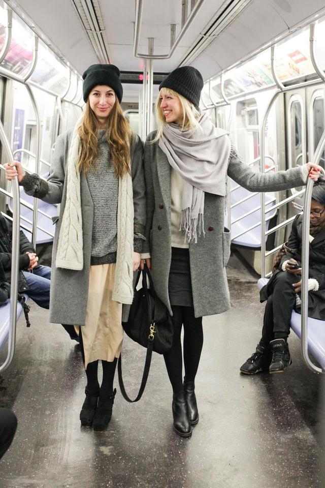 Tips1::经典黑灰色系搭配,因为围巾和帽子等配饰的加入而更有混搭感,虽是同色系,但不同的面料材质拉开了层次。