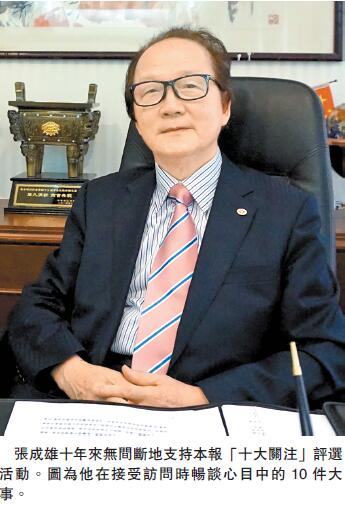 【香港商報網訊】記者于寧寧報道:香港中華總商會榮譽會長、香港潮州商會會長張成雄由香港商報與各大商會第一年搞「香港商界最關注10件大事」評選活動至今,十年來無間斷的大力支持,除親自出席頒獎典禮外,還每年均接受記者訪問暢談他心目中的10件大事。剛過去的2015年,「政改方案未獲通過」、「經濟最自由港21度濽莊」、「『一簽多行』改『一周一行』」、「兩地基金互認安排簽備忘錄」、「人民幣加入SDR國際化加速」、「57創始國簽亞投行協定」、「中英公布『倫港通』等合作計劃」、「『十三五』規劃出臺涉多個範疇」、「習馬握手創歷史新一頁」及「區議會選舉投票創紀錄」等,都是他視為重要的大事。