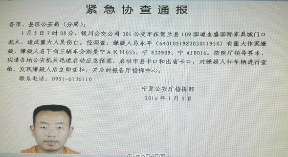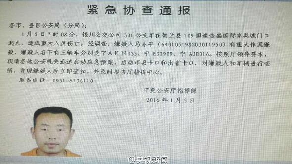 事故发生后,宁夏回族自治区公安厅发布协查通报,追捕造成公交起火案犯罪嫌疑人马永平。