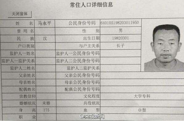 另据宁夏公安厅指挥部发出的协查通报:嫌疑人马永平,身份证号为640105198203011950,有重大作案嫌疑。其名下有3辆车:宁AKN035、宁E32909、宁AJB016。警方正在查缉。