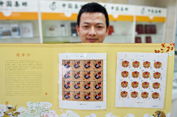 当日,中国邮政发行《丙申年》特种邮票一套两枚,图案内容分别为:灵猴献瑞、福寿双至。全套邮票面值为2.40元。据了解,这套邮票是我国第四轮生肖邮票的开篇之作,也是首轮猴票的设计者黄永玉时隔36年再执笔。邮票第一图,猴子手托寿桃,面带笑容。第二图,一只金猴抱着两只橘色的小猴象征亲情,也寄托着福寿双至的吉祥寓意。