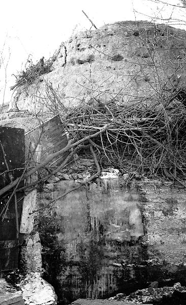 在宝顶下方,记者还发现了磨砖对缝的砖墙,怀疑再往下就是地宫,但被土掩埋。周围民房排放的生活污水,就从遗迹周围流淌而过,凝结成坚固的冰挂。
