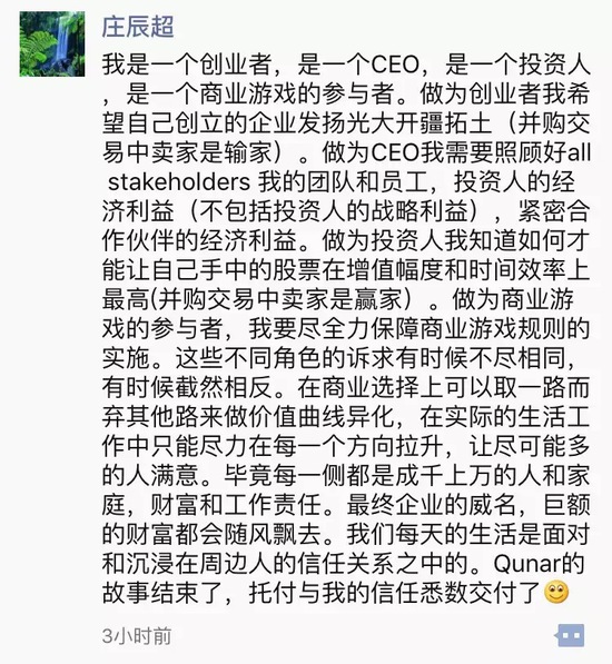 網易科技訊 1月6日消息,4日,莊辰超正式宣布從去哪兒離職,今天莊辰超通過其朋友圈再度表態:“Qunar的故事結束了,托付與我的信任悉數交付了。”