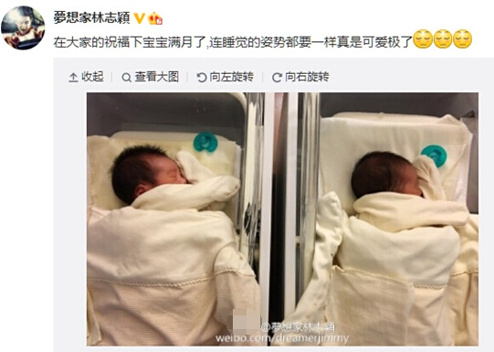 中新网1月5日电 今日,林志颖在微博晒出双胞胎儿子照片庆祝他们满月,“在大家的祝福下宝宝满月了,连睡觉的姿势都要一样,真是可爱极了”。照片中,两个孩子正在熟睡,模样可爱。