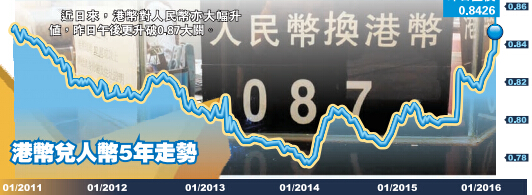 因人民币汇价近期波动剧烈,紧盯美元的港币近日对人民币亦大幅升值,前日100港元兑人民币汇价升越85元关口,昨日中午又升过86元,午後更升破87大关。