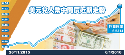 【香港商报网讯】记者锺侠报道:内地官方昨公布人民币对美元汇率中间价报6.5314,刷新逾4年半新低。此波跌势从去年12月25日开始,连续7个交易日已下跌601个点子,显示人民币对美元汇率「跨年」下跌仍在继续。有分析称,人民币此番下跌,皆因中国宏观经济仍处低位,加上美联储加息预期依然存在。为推动人民币国际化进程,当局有责任维持人民币汇率的均衡稳定。