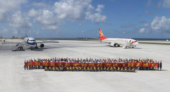两架民航客机6日降落南沙永暑礁新建机场。这是相关人员合影留念。新华社